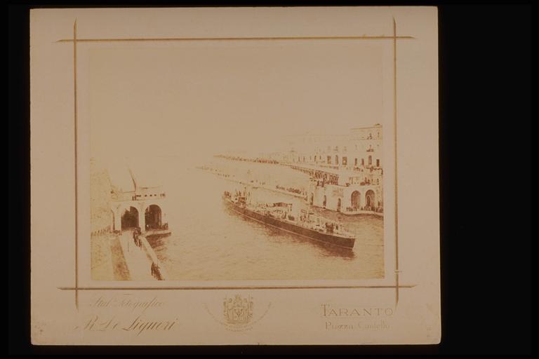 titolazione-fotografica-sul supporto primario: recto-Nave nel canale di Taranto | commerciale-tipografica-sul supporto secondario: recto: in basso-Stab.to Fotografico/ R. De Liguori/ TARANTO/ Piazza Castello