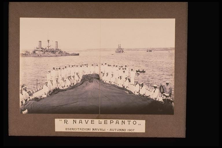 didascalica-tipografica-sul supporto secondario: recto: nell' etichetta- R. NAVE LEPANTO"/ ESERCITAZIONI NAVALI - AUTUNNO 1907"