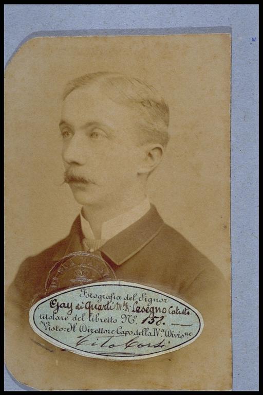 titolazione-manoscritto a inchiostro-su etichetta sul supporto primario: recto: in basso-Fotografia del Signor Gay di Quarti M.se di Lesegno Calisto titolare del libretto N.° 158. Visto: Il Direttore Capo della IV Divis.ne Tito Corti | documentaria-manoscritto a inchiostro-su etichetta sul supporto secondario: verso-Gay di Quarti Marchese di Lesegno Calisto; Gentiluomo di Corte di S.A.R. la Duchessa di Genova|documentaria-tipografica-sul verso-A. Bertelli e Comp. o successori a Montabone Fotografi e pittori di S.M. Umberto I° Re d'Italia e Real Famiglia e Reali Principi Torino Casa Madre Piazza San Carlo, 2. Galleria Natta, 1.